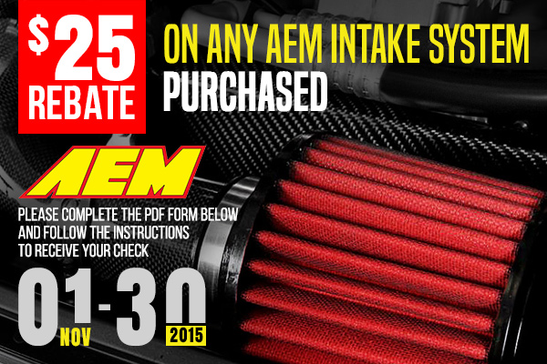 Purchase any AEM Intake System and receive a $25.00 check by mail. Do not hesitate, this offer is valid from November 1 through November 30, 2015.